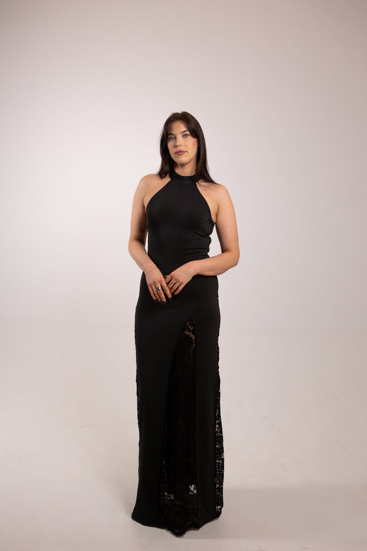 The Celine Maxi Dress is your floor-length power move. Cut from thick, luxurious jersey that sculpts and smooths, this halterneck gown features versatile long straps, seductive lace hip inserts, and an asymmetric front that commands attention.